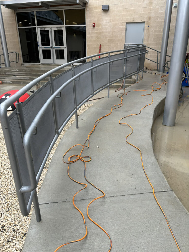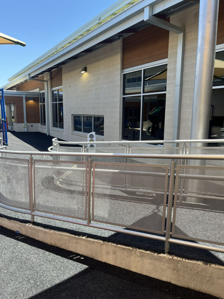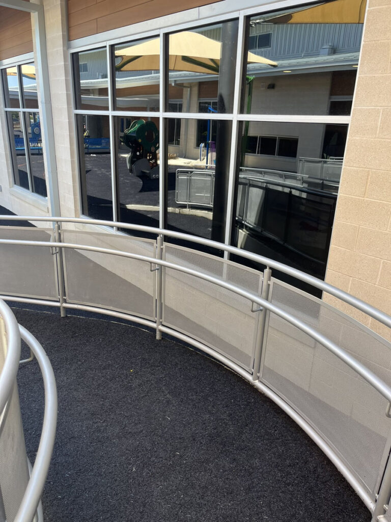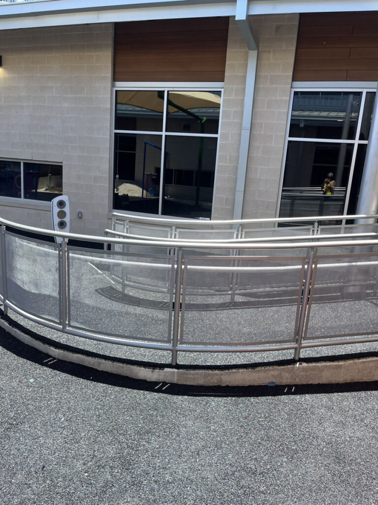 FABRICATION AND INSTALLATION OF GUARDRAILING AT RADIUS RAMP RAILINGS WITH MCNICHOLS PERFORATED PANELING AND U-EDGE BANDING. FIELD MEASUREMENTS TAKEN AND PERFORMED IN-HOUSE BY KENDALIA METALWORKS