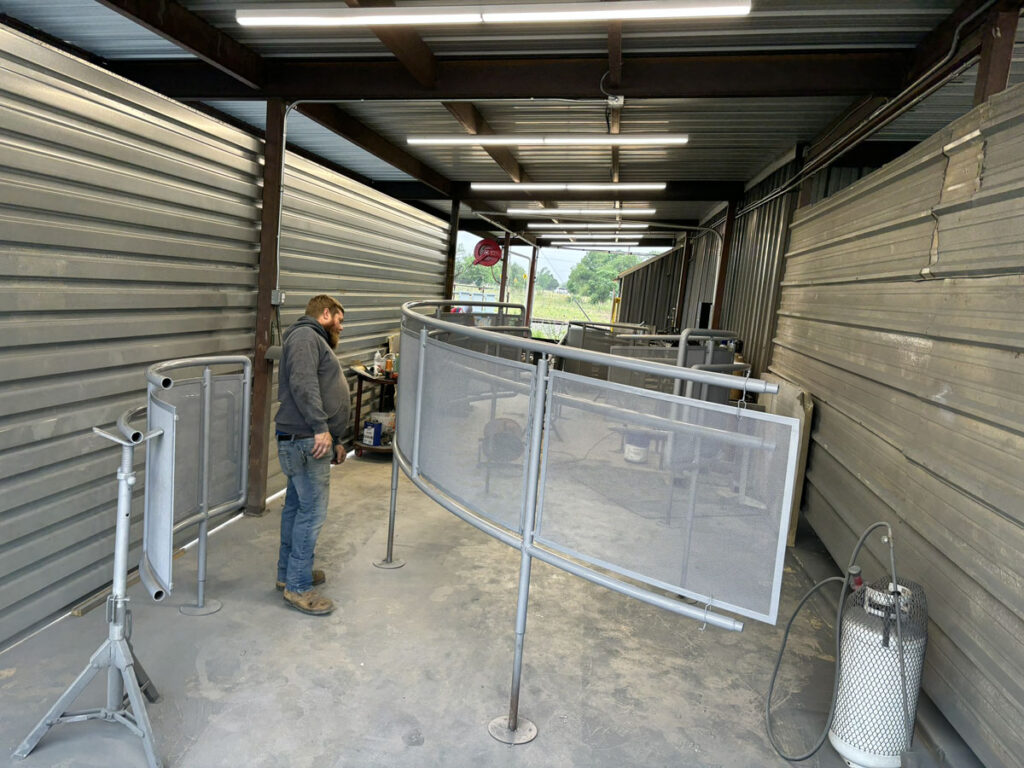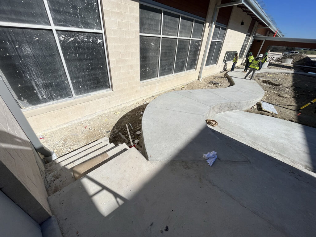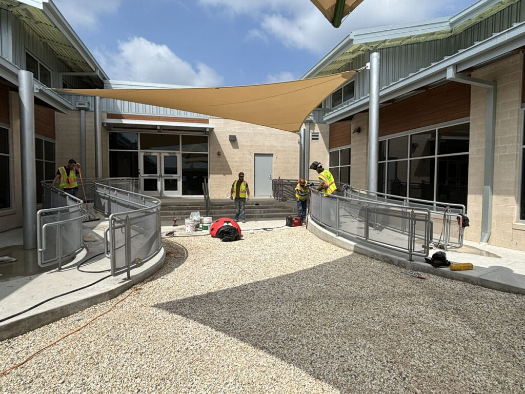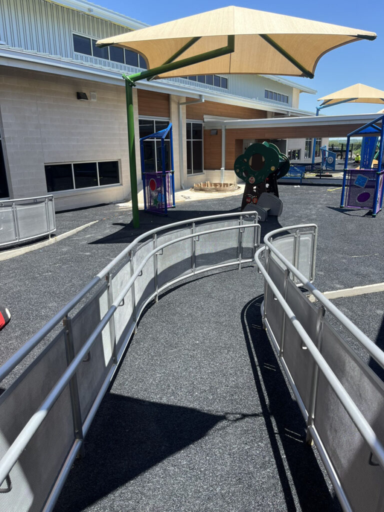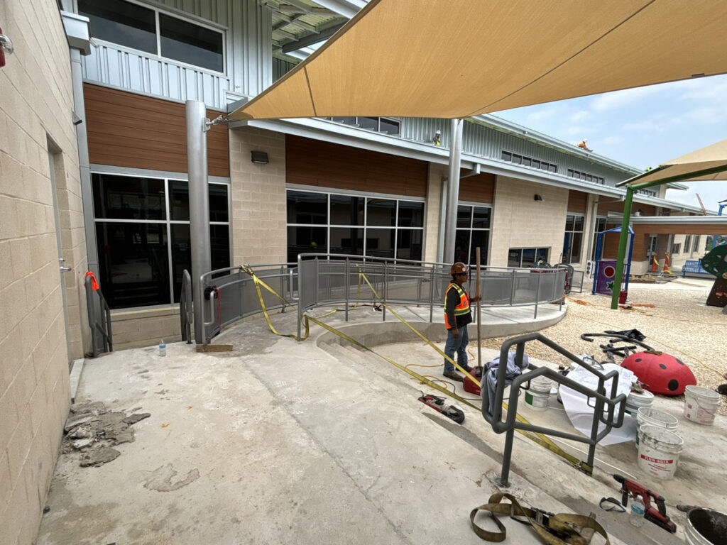 FABRICATION AND INSTALLATION OF GUARDRAILING AT RADIUS RAMP RAILINGS WITH MCNICHOLS PERFORATED PANELING AND U-EDGE BANDING. FIELD MEASUREMENTS TAKEN AND PERFORMED IN-HOUSE BY KENDALIA METALWORKS