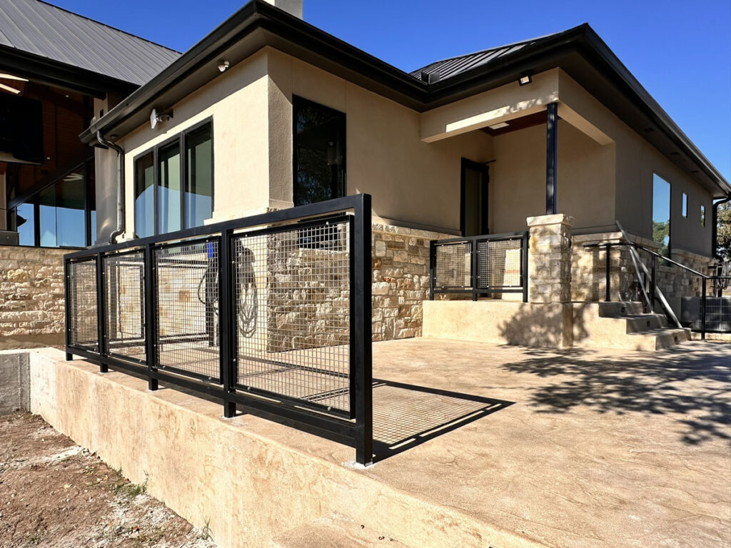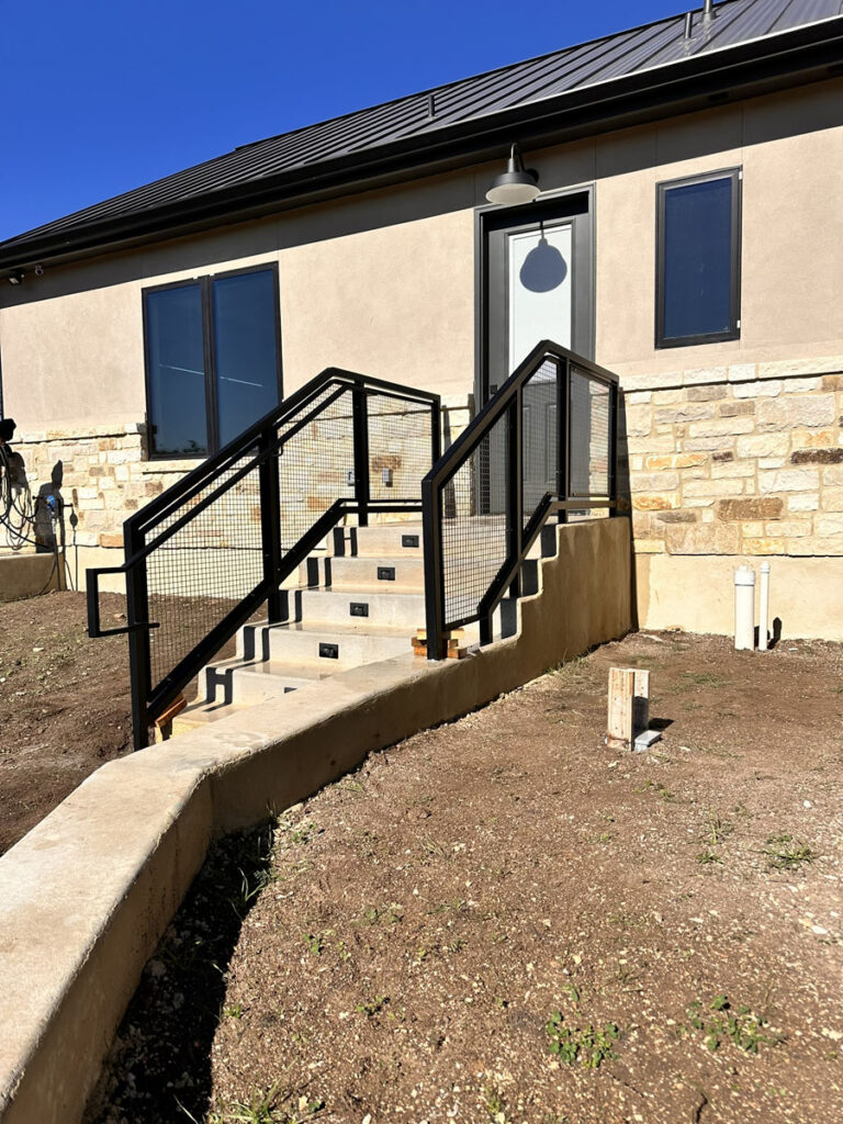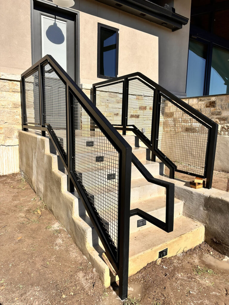 FABRICATION AND INSTALLATION OF RAILINGS AT A NEW RESIDENCE IN NEW BRAUNFELS TX, STAINLESS 2X2 WIRE MESH WAS USED WITH AN ANGLE PICTURE FRAME, ALL ASSEMBLIES WERE POWDERCOATED AFTER FABRICATION